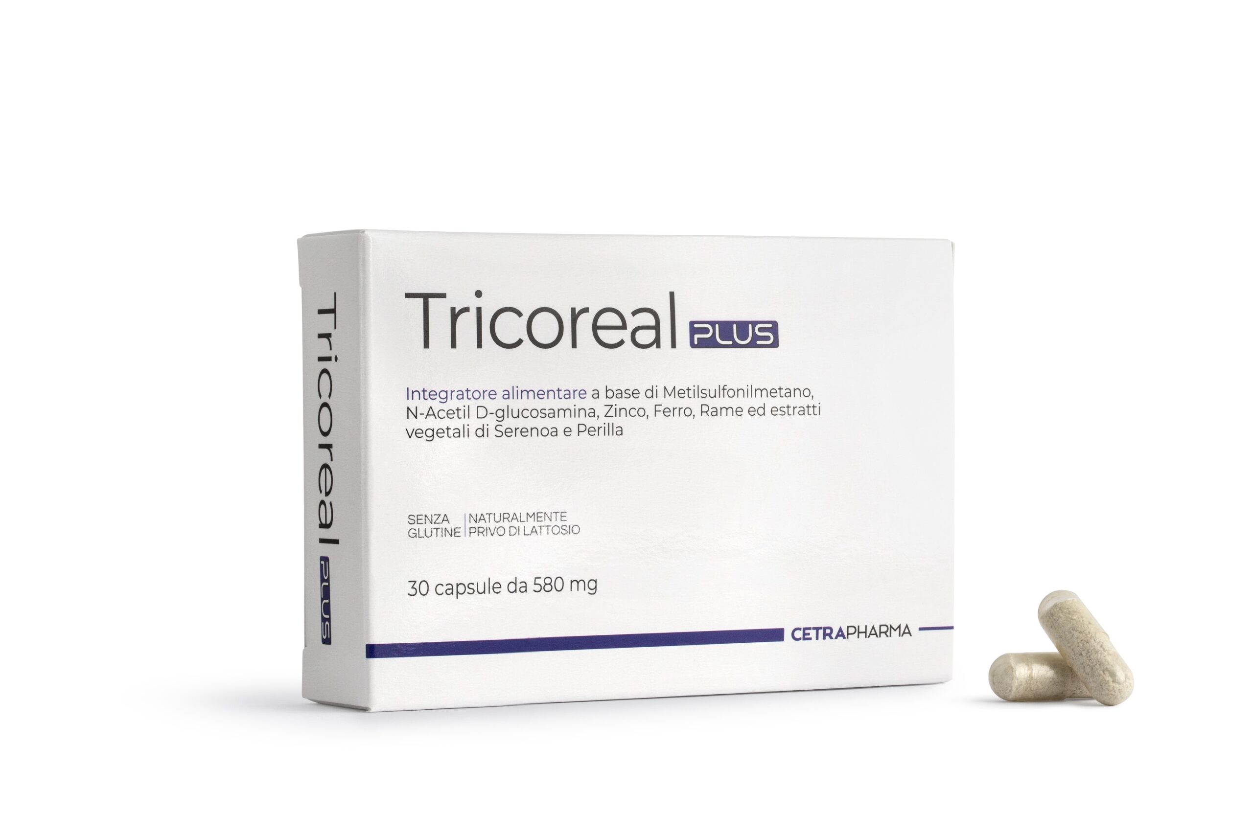 Tricoreal PLUS è un integratore alimentare a base di Metilsulfonilmetano, Acetil – glucosamina, estratti vegetali di Serenoa Repens e Perilla, Zinco, Ferro e Rame.